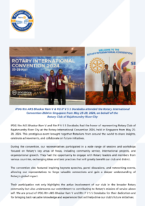 IPDG Rtn AKS Bhaskar Ram V and Rtn P V S S Dorababu had the honour of representing the Rotary Club of Rajahmundry River City at the Rotary International Convention 2024, held in Singapore from May 25-29, 2024. This prestigious event brought together Rotarians from around the world to share insights, celebrate achievements, and collaborate on future initiatives.